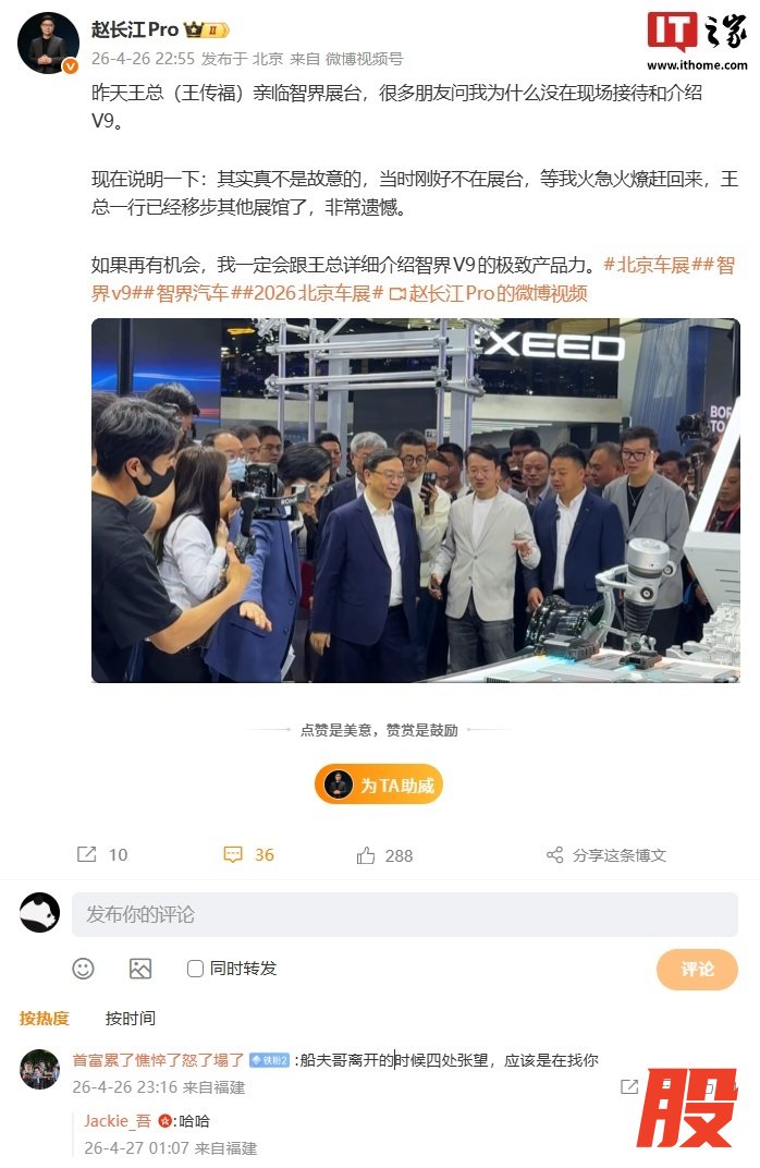 IT之家 4 月 27 日消息,智界汽车执行董事及执行副总裁赵长江昨晚发文回应了王传福(比亚迪董事长兼总裁)亲临智界展台,为何自己没在现场接待和介绍 V9。他表示: