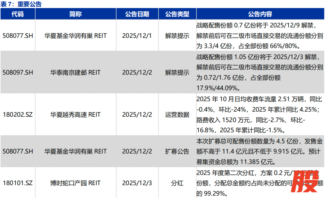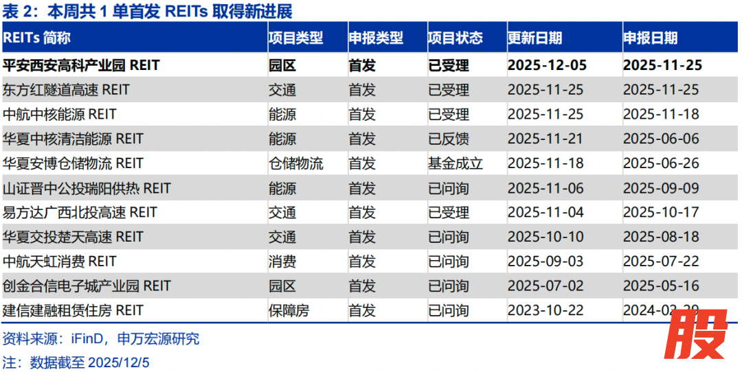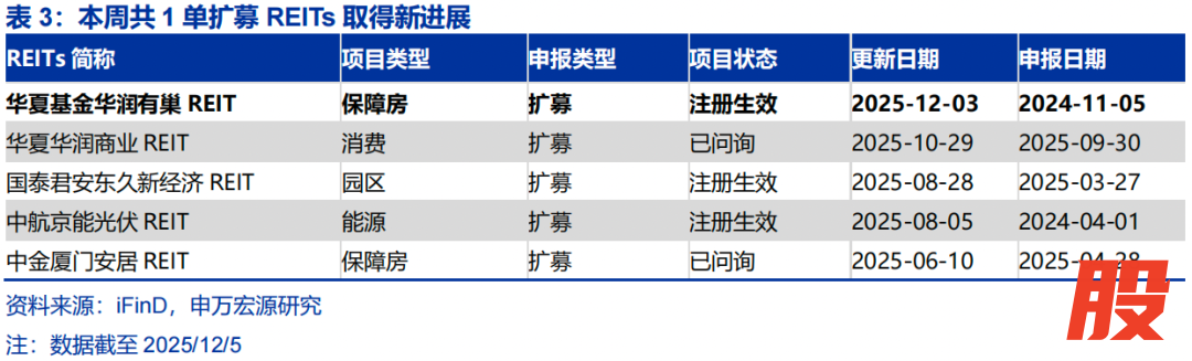 一级市场:截至2025/12/5,今年以来已成功发行19单(25Q1发行6单、25Q2发行4单、25Q3发行6单、10月发行2单、11月发行1单);发行规模387.9亿元、同比下降35.8%。本周共1单首发公募REITs取得新进展:平安西安高科产业园REIT已受理,底层资产为西安高新区软件新城,评估价值13.6亿元。本周共1单扩募公募REITs取得新进展:华夏基金华润有巢REIT扩募份额发售,采用向原持有人配售的方式(市场首单采用向原持有人配售方式的扩募),预计募集资金总额为11.385亿元。当前审批流程中REITs:(1)已申报11只,已问询并反馈2只,通过审核1只,注册生效待上市1只。(2)扩募:已申报5只,已问询并反馈3只,通过审核3只。