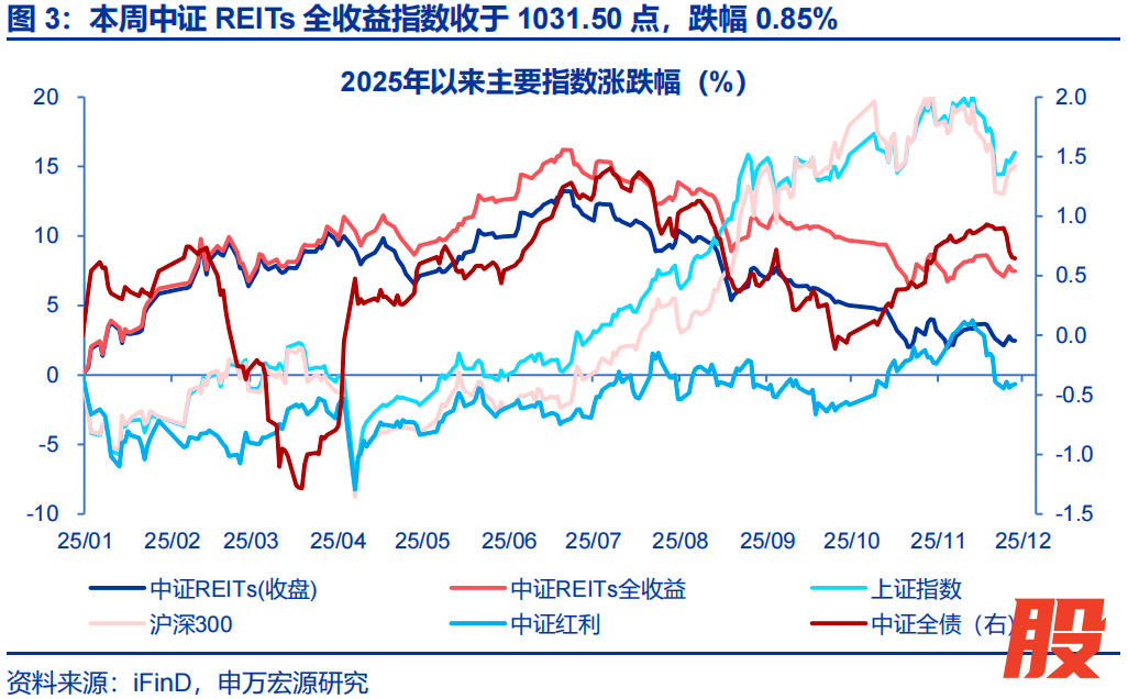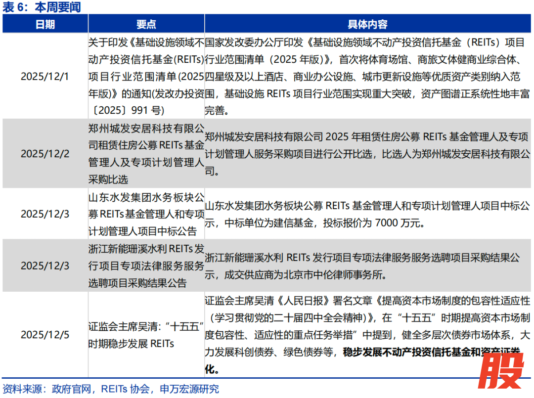 城市更新设施、高端酒店等纳入基础设施REITs申报!本周债市大幅调整,REITs市场整体承压,仅周三短暂修复,其余四个交易日持续走低,流动性明显收缩。各板块普跌,唯数据中心逆势收涨。本周“国产GPU第一股”摩尔线程上市大涨、第二股沐曦股份开始申购,算力概念持续发酵下,数据中心资产兼具稳定性与成长性,仍具有较大潜力。政策面继续突破,本周一,国家发改委办公厅印发《基础设施领域不动产投资信托基金(REITs)项目行业范围清单(2025年版)》,首次将体育场馆、商旅文体健商业综合体、酒店、商业办公设施、城市更新设施纳入申报范围,相较于上周证监会提出的商业不动产REITs(尚未明确申报要求),此次基础设施REITs扩围对传统商业地产提出了更具体的准入标准:四星级及以上酒店,超大特大城市的超甲级、甲级商务楼宇项目,延续了基础设施REITs服务国家战略、“稳中求进”的发展思路。此外,证监会吴清主席在《人民日报》发表署名文章,进一步强调“十五五”时期将稳步发展REITs,为行业发展注入信心。