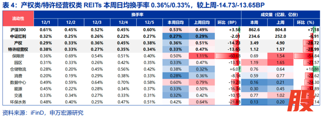 流动性:产权类/特许经营权类REITs本周日均换手率0.36%/0.33%,较上周-14.73/-13.65BP,周内成交量3.49/1.12亿份,周环比-28.72%/-28.99%。数据中心板块活跃度最高。